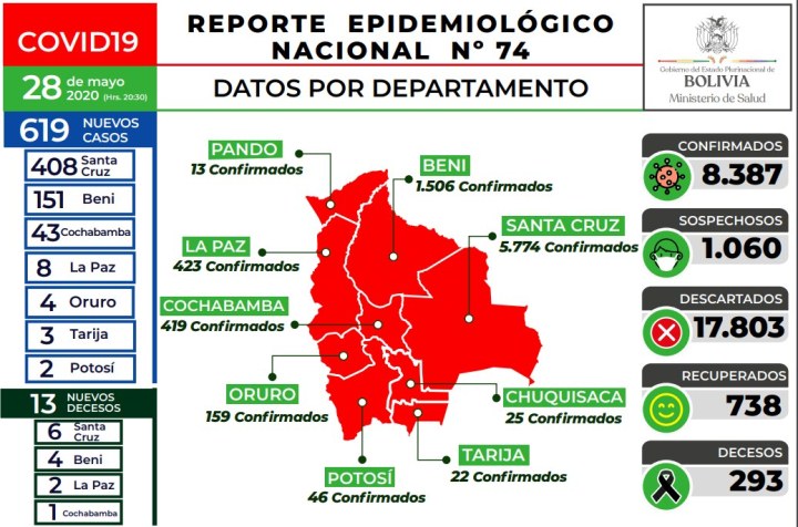 La Paz, 28 may (UC/MS).- El Ministerio de Salud informó que el país llegó hoy a 8.387 contagios de coronavirus (COVID-19), con 619 nuevos infectados reportados en las últimas horas en siete departamentos.