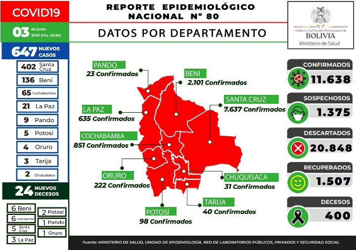 Con esos datos el total acumulado de contagios asciende a 11.638, que están distribuidos de la siguiente manera: Santa Cruz 7.637, Beni 2.101, Cochabamba 851, La Paz 635, Oruro 222, Potosí 98, Tarija 40, Chuquisaca 31 y Pando 23.