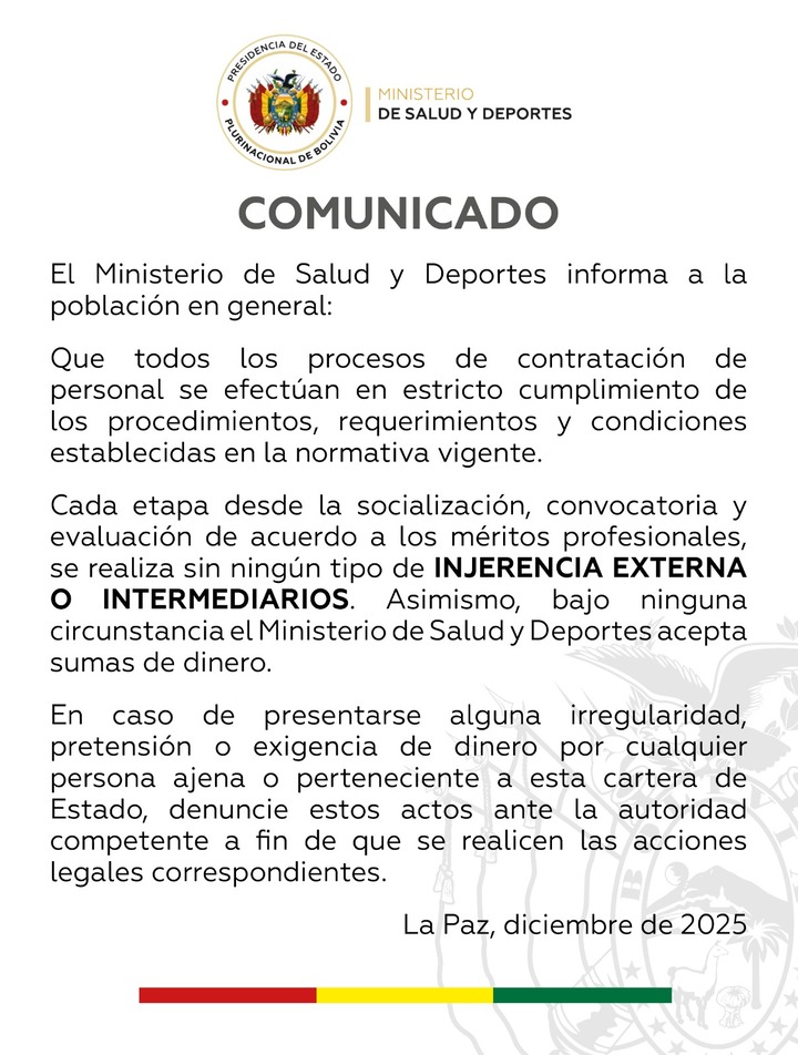 Cada etapa desde la socialización, convocatoria y evaluación de acuerdo a los méritos profesionales, se realiza sin ningún tipo de INJERENCIA EXTERNA O INTERMEDIARIOS. Asimismo, bajo ninguna circunstancia el Ministerio de Salud y Deportes acepta sumas de dinero.