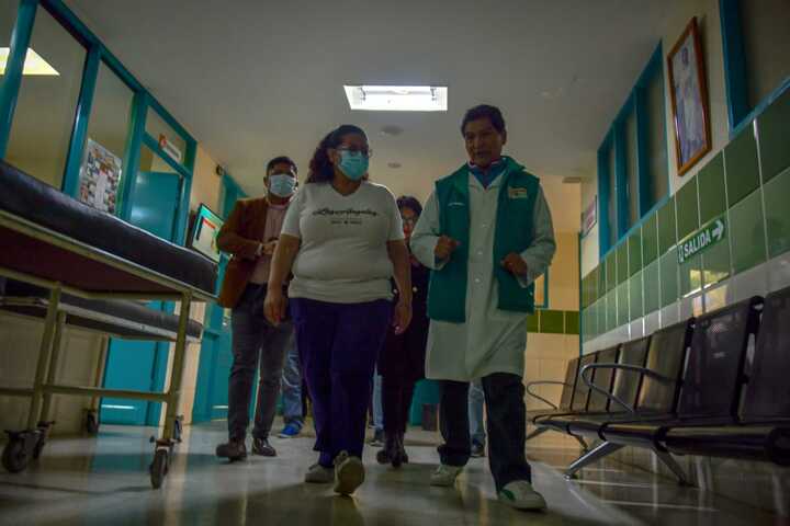 Acompañada de asesores y un equipo de expertos, Flores Zambrana terminó el recorrido visitando el Hospital Corazón de Jesús, donde se entrevistó con los médicos, quienes le brindaron un detalle pormenorizado de los hospitalizados.