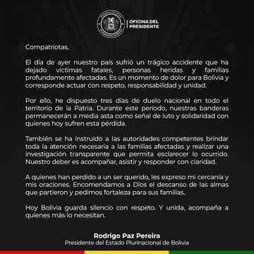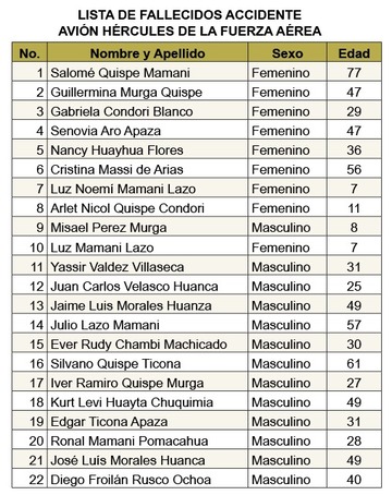 El Alto, 1 de marzo de 2026 (MSD/UCOM051).- El accidente aéreo suscitado por un avión de carga Hércules de la Fuerza Aérea, el paso viernes en la ciudad de El Alto, se hizo conocer la lista actualizada de fallecidos que asciende a 22 personas, cuatro menores de edad, seis de sexo femenino y 12 de sexo masculino.
