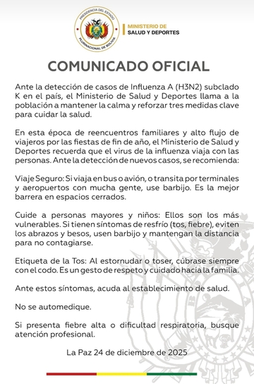La Paz, 24 de diciembre de 2025 (MSD/UCOM).- El Ministerio de Salud y Deportes confirmó este miércoles dos casos positivos de Influenza A H3N2, identificándose la presencia del subclado K, considerado de alta relevancia epidemiológica, informó en conferencia de prensa la ministra de Salud y Deportes, Marcela Flores Zambrana.