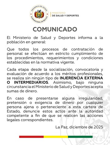 La Paz, 24 de diciembre de 2025 (MSD/UCOM).- La ministra de Salud y Deportes, Marcela Flores Zambrana, denunció públicamente que personas inescrupulosas aperturaron cuentas falsas en redes sociales a su nombre y al del ministro de la Presidencia, José Luis Lupo, con el objetivo de cobrar dinero a cambio de supuestos cargos en esa cartera de Estado.