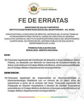 El Ministerio de Salud y Deportes convoca a los 𝗖𝗼𝗻𝘀𝗲𝗷𝗼𝘀 𝗱𝗲𝗽𝗮𝗿𝘁𝗮𝗺𝗲𝗻𝘁𝗮𝗹𝗲𝘀 𝗱𝗲 𝗺𝗲𝗱𝗶𝗰𝗶𝗻𝗮 𝘁𝗿𝗮𝗱𝗶𝗰𝗶𝗼𝗻𝗮𝗹, 𝗖𝗼𝗻𝗳𝗲𝗱𝗲𝗿𝗮𝗰𝗶𝗼𝗻𝗲𝘀 𝗻𝗮𝗰𝗶𝗼𝗻𝗮𝗹𝗲𝘀 𝗱𝗲 𝗺𝗲𝗱𝗶𝗰𝗶𝗻𝗮 𝘁𝗿𝗮𝗱𝗶𝗰𝗶𝗼𝗻𝗮𝗹, 𝗳𝗲𝗱𝗲𝗿𝗮𝗰𝗶𝗼𝗻𝗲𝘀 𝘆 𝗮𝘀𝗼𝗰𝗶𝗮𝗰𝗶𝗼𝗻𝗲𝘀 con personería jurídica vigente, a la reunión para la elección del Director General de Medicina Tradicional que se realizará bajo usos y costumbres el día lunes 12 de enero de 2026 a hrs.09:00 a.m. en el Auditorio del Ministerio de Salud y Deportes.